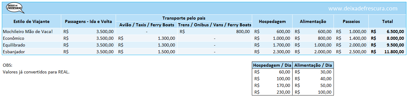 Na tabela, levamos em consideração exatamente isso. Um mochileiro vai economizar em sua hospedagem, pois a grana muitas vezes é curta. Já o esbanjador, vai querer ficar nos melhores resorts.